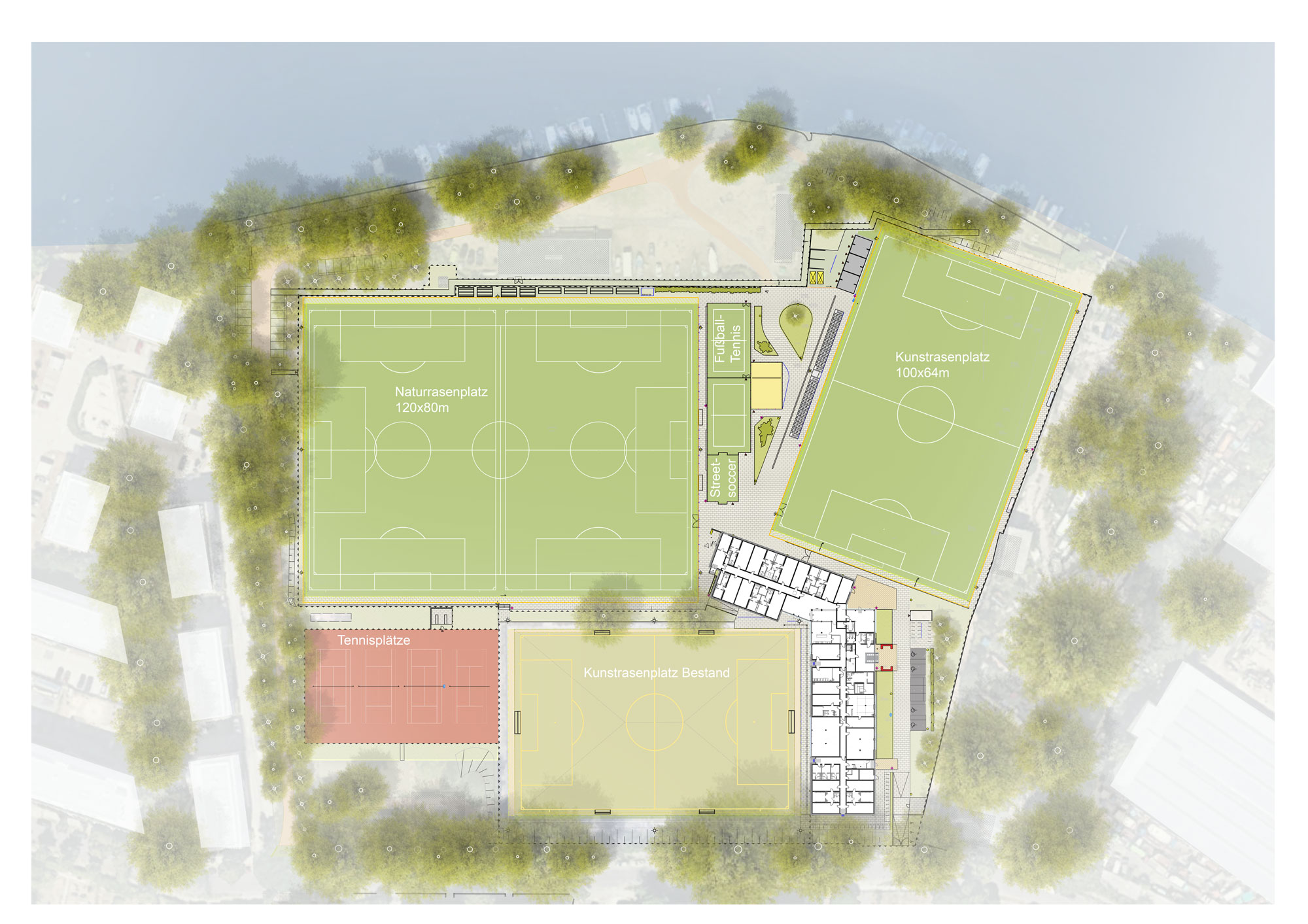 Die Anlage erhielt eine Tribünenanlage für Training und Spielbetrieb. Ergänzend haben wir einen Wirtschaftshof mit Garagen und Sodengartenflächen vorgesehen. Der Sodengarten dient der Regeneration der Plätze: Rasensoden können dort angezogen und bei Bedarf schnell eingebaut werden.