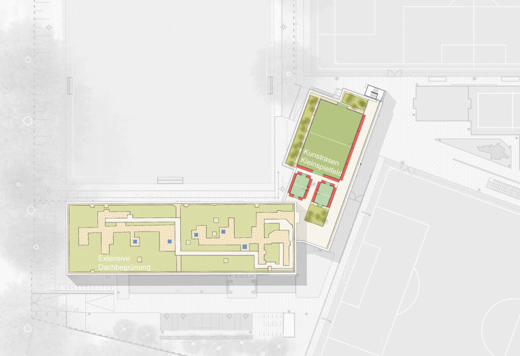 Zum Projekt gehörte außerdem der Umbau und die Sanierung der Tennisanlage. Ein besonderes Merkmal bildet die extensive Dachbegrünung mit Minisportfeldern. Sie übernimmt ökologische Funktionen wie Regenwasserrückhalt und ergänzt die sportliche Nutzung.