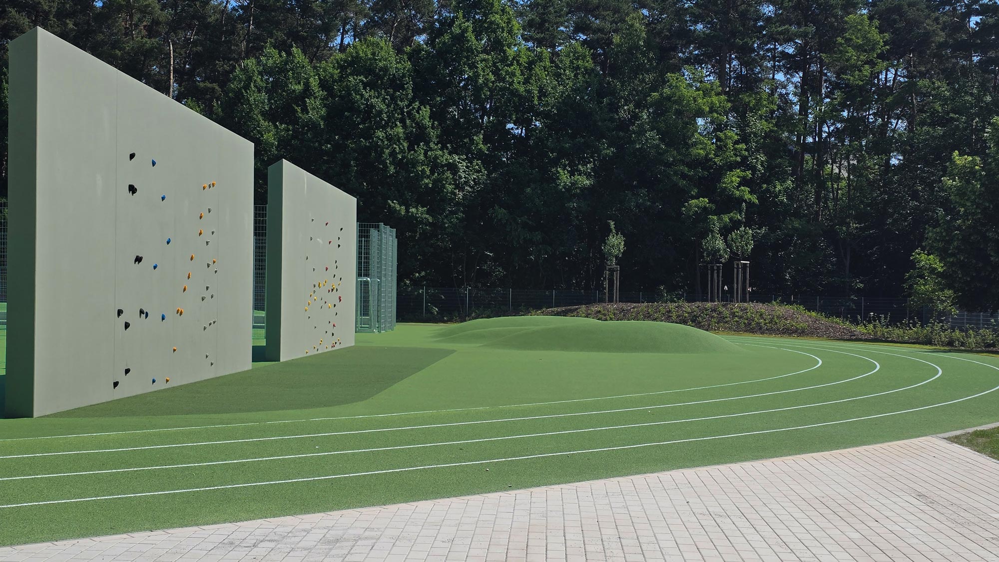 Darüber hinaus haben wir zusätzliche Bewegungsangebote integriert: Ein Motorikspielfeld für Ballsportarten, Boulderwände, ein 360°-Ball, ein Teqball-Tisch sowie Beachvolleyball- und Beachhandballfelder fördern spielerisch Koordination, Teamgeist und Bewegungslust.